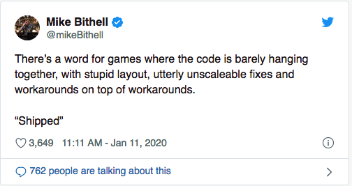 “Almost every single game I’ve worked on has shipped at the exact moment that the bits of spit and prayer holding the whole edifice together are on the *brink* of collapse,” wrote game developer James Patton, in a Twitter discussion about game code.