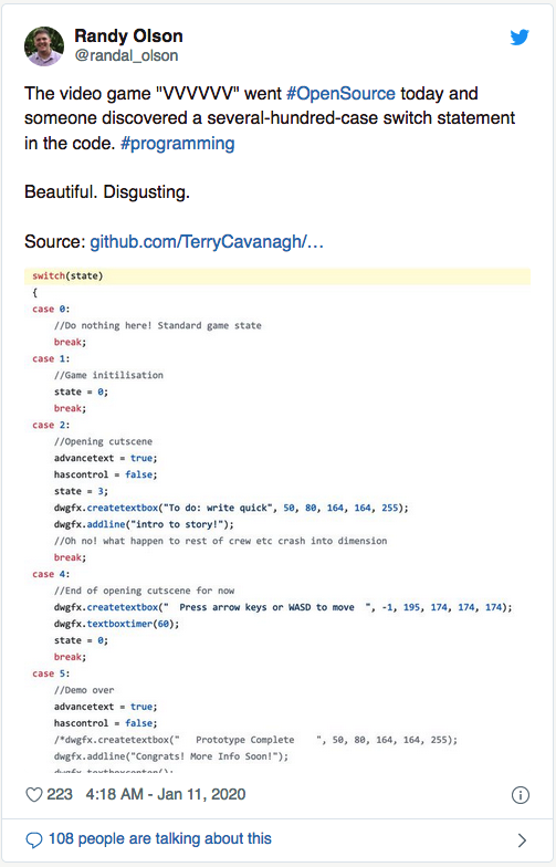 In this case, there’s a particular portion of the VVVVVV source code that is sparking discussion due to its sheer messiness. Basically, it’s something that helps decide what state a game is in, whether that’s a cutscene or a piece of dialogue. Normally, many of these states might be grouped separately — the mini-game portions written in a different area than say, a jump mechanic — but not in this case. As a random example, Cavanagh appears to have dozens of game states referring to cutscenes sprinkled among parts of the code that are also about things like gameplay modes and the main menu.